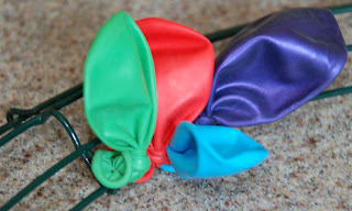 I started out with a wire wreath I found at Micheals for $2.99 and about 8 bags of balloons from the Dollar Store:)